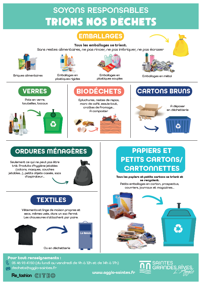Le tri évolue Vos emballages de type cartons d’emballage, plastiques et les articles en aluminium (boîtes de conserve, barquettes…) doivent être collectés dans des sacs jaunes disponibles : à l’accueil de votre mairie à la déchetterie de Corme Royal ou de Saintes à l’accueil de la Communauté d’Agglomération Pour en savoir plus sur le tri, cliquez ici